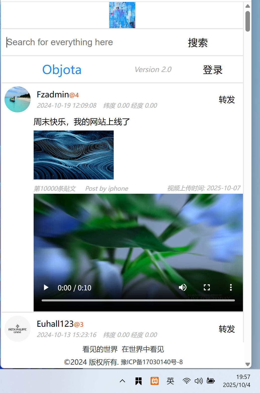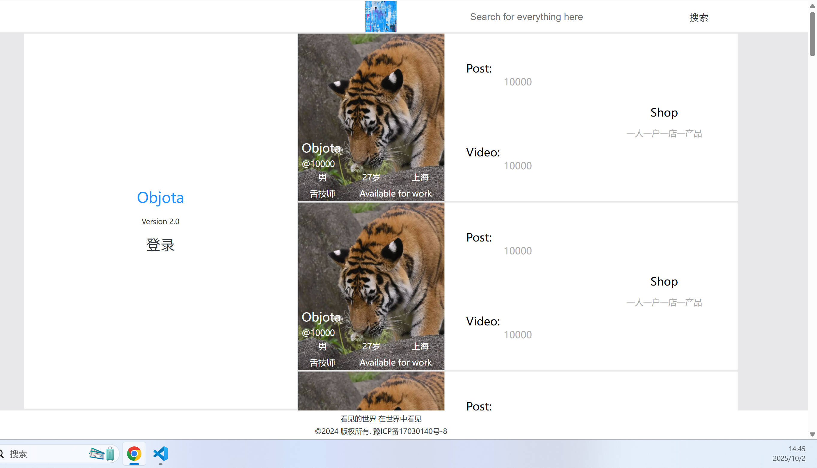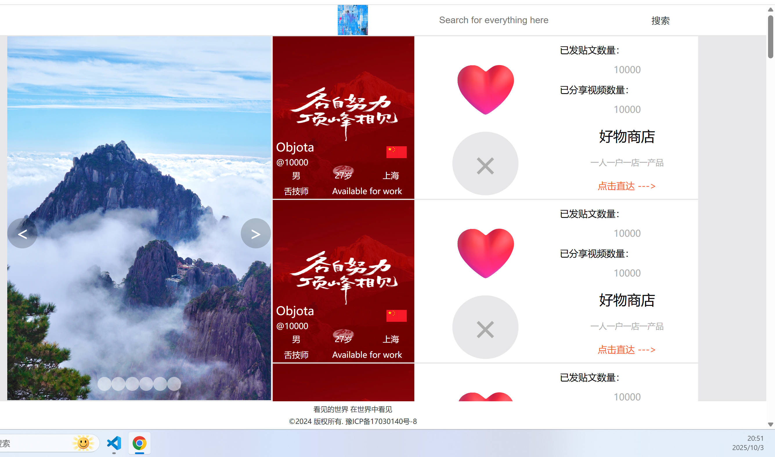 说明:点击1️⃣显示网站名字版本号和登录;点击2️⃣是搜索模块,目前才293条贴文,所以搜索结果暂未开发;点击3️⃣是个人形象展示,个人可以上传六张照片用来交友;点击5️⃣带货模块,一人一号一店一产品,整个平台就独一家有售某个产品;点击4️⃣是放大图片;点击6️⃣是查看短视频!