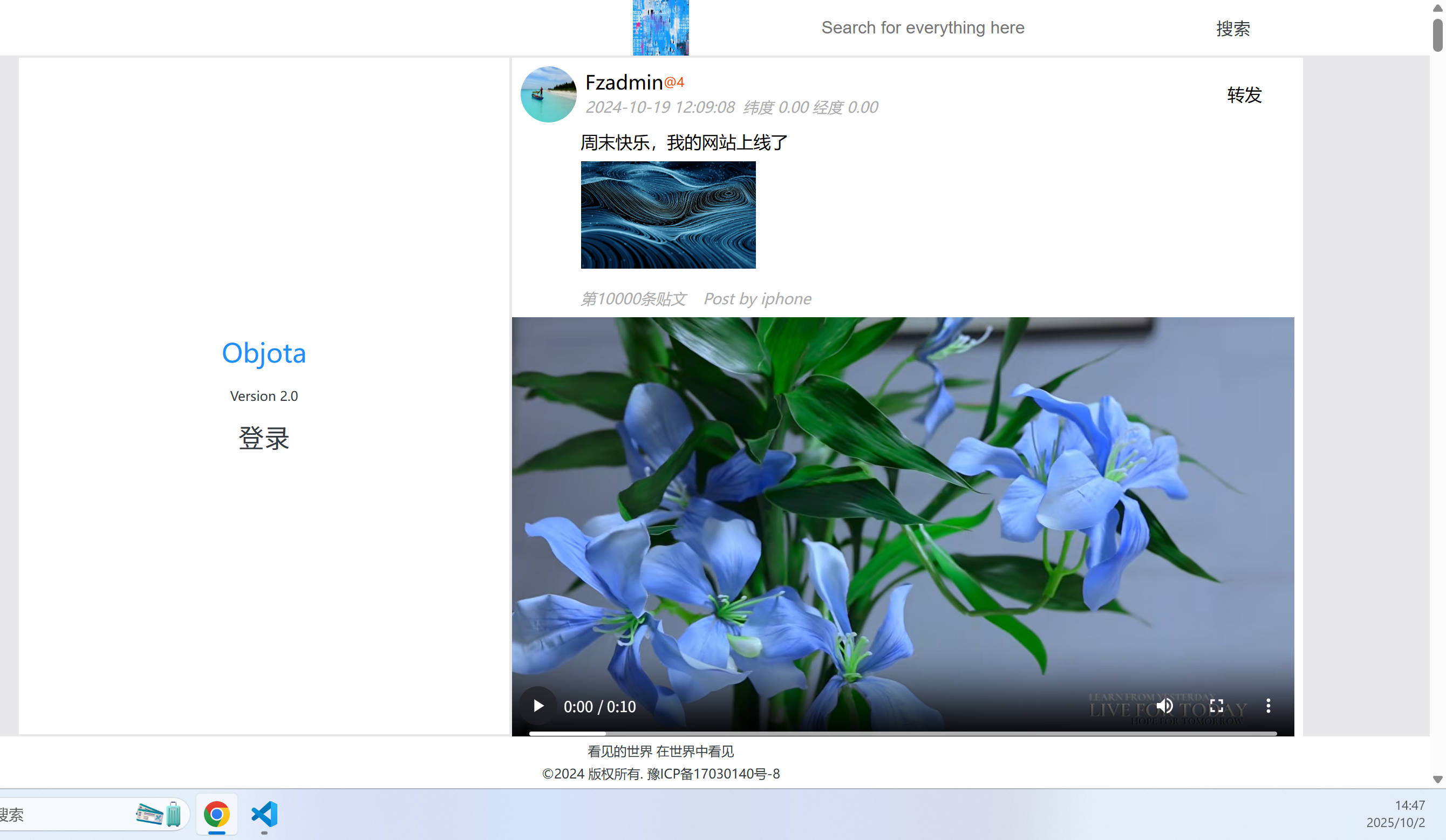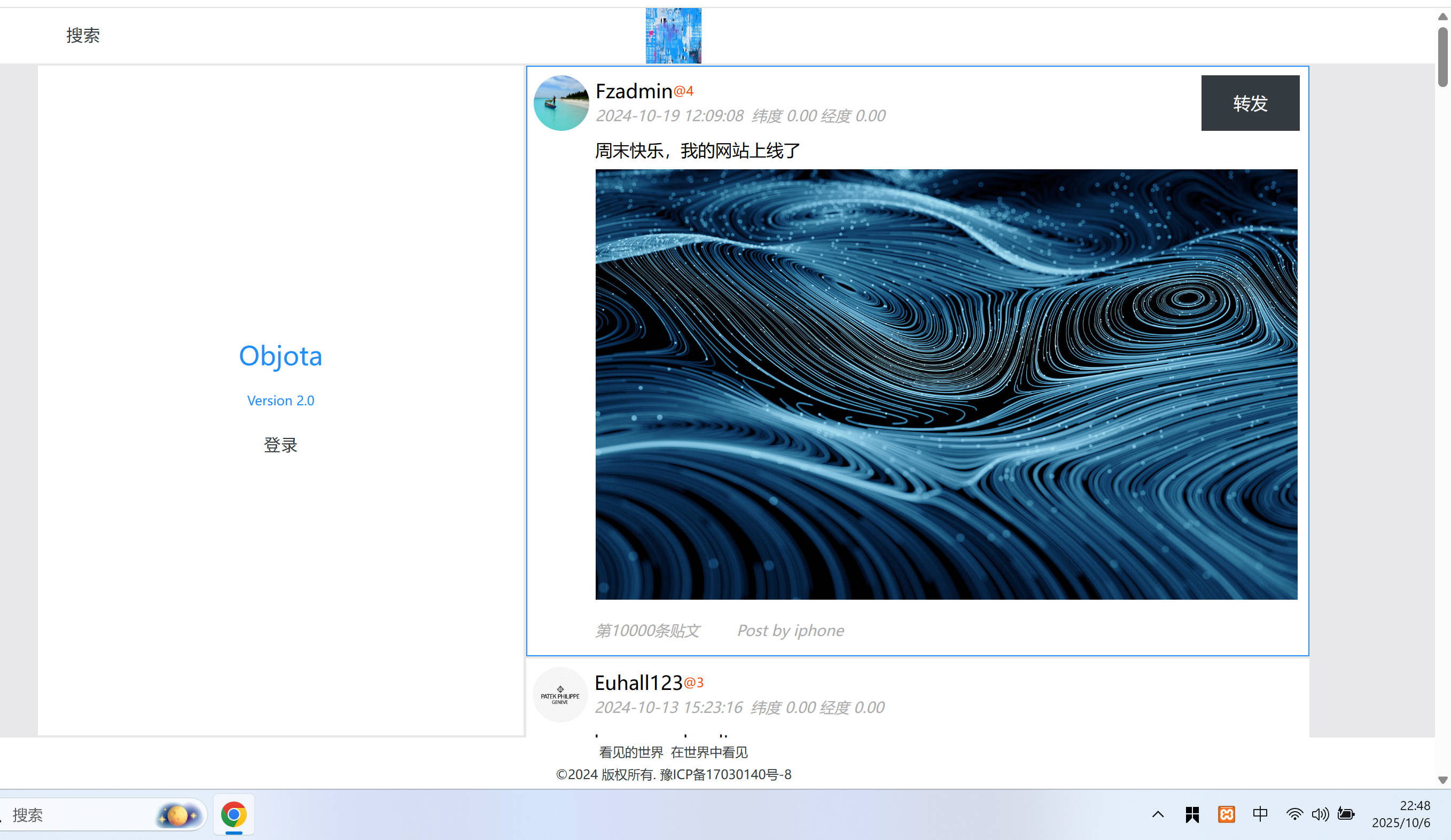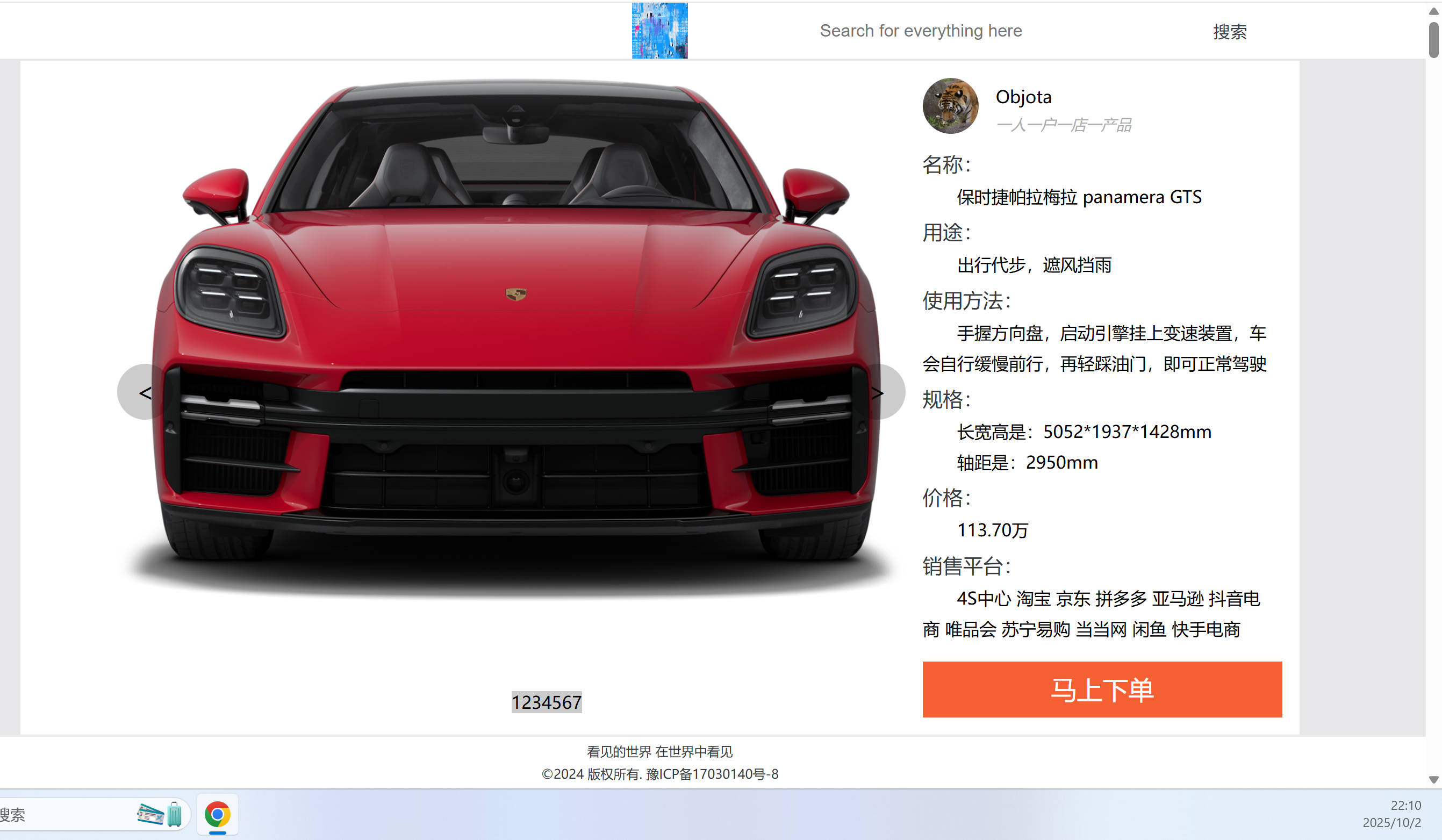 说明:点击1️⃣显示网站名字版本号和登录;点击2️⃣是搜索模块,目前才293条贴文,所以搜索结果暂未开发;点击3️⃣是个人形象展示,个人可以上传六张照片用来交友;点击5️⃣带货模块,一人一号一店一产品,整个平台就独一家有售某个产品;点击4️⃣是放大图片;点击6️⃣是查看短视频!