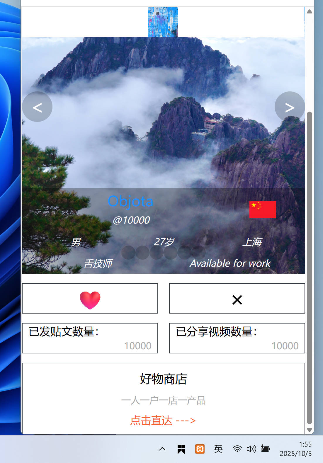 主页贴文区域需要显示的内容包括:名字,发布贴文的具体时间和位置,以及用什么设备发布的,第几条贴文,贴文的文本内容,图片内容,视频内容,除此之外,再显示一个商店的图标,添加商店的功能就是想着我在分享我生活的同时,我还希望我能在这里赚点钱。这比较符合人性的内在诉求。